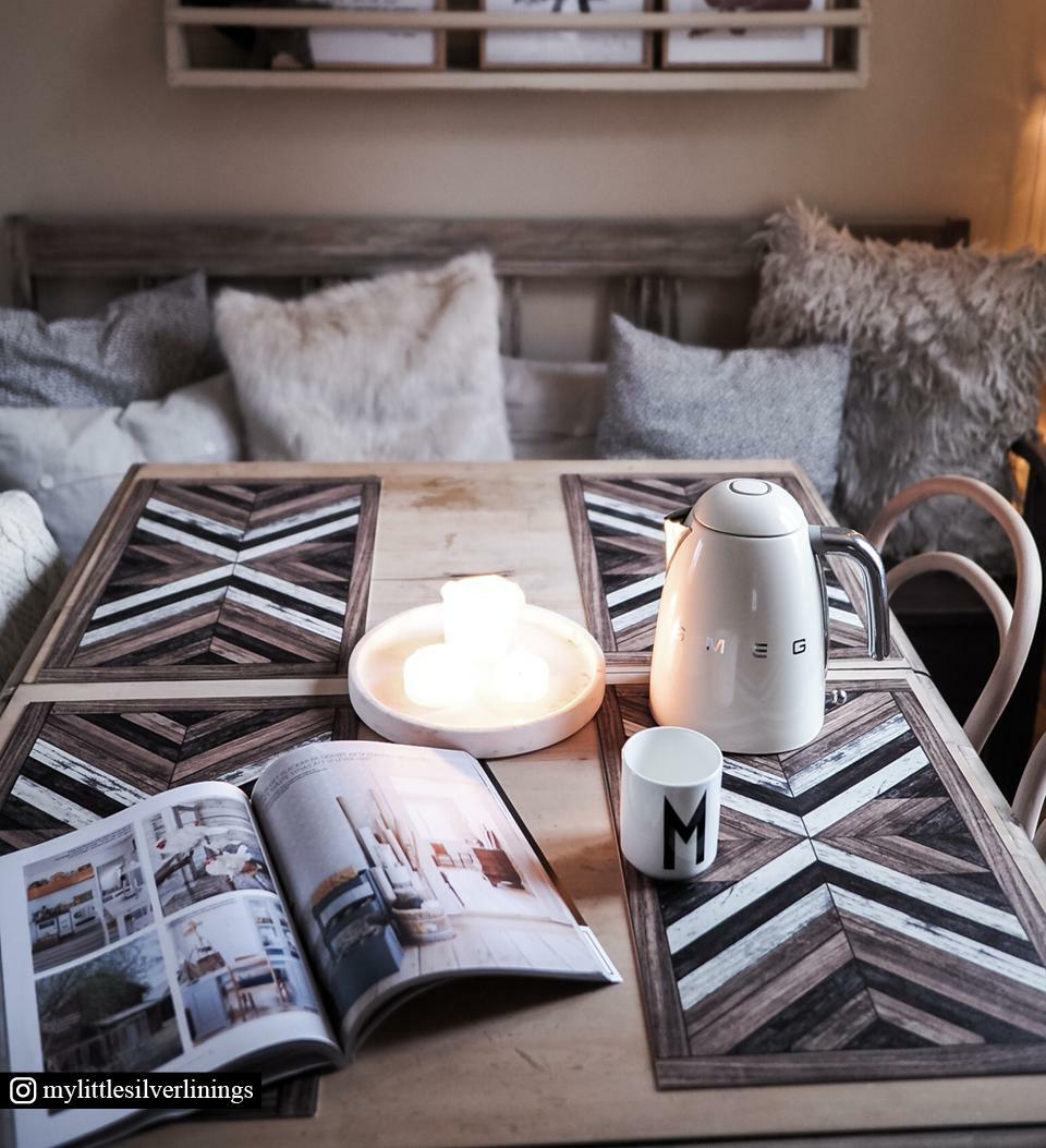 桌墊採用優質、易於清潔的乙烯基片材製成,有多種設計可供選擇:仿古瓷磚、拆衷主義和十字繡。